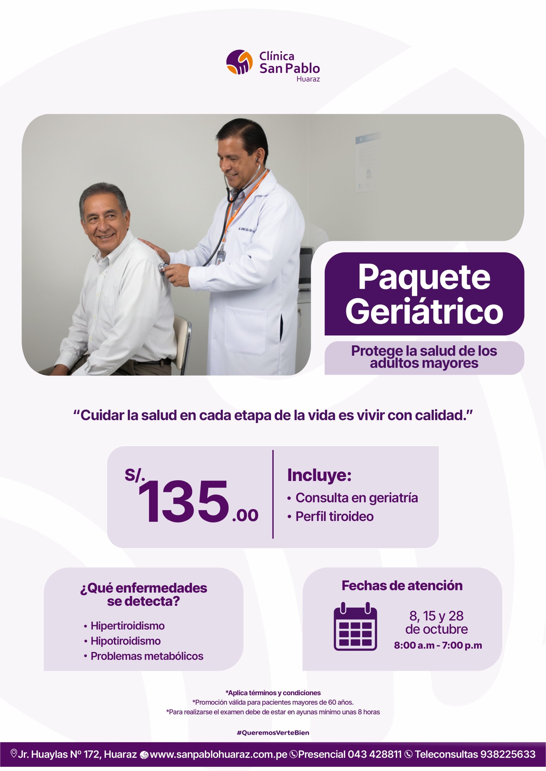 En Clínica San Pablo Huaraz cuidamos la salud integral de nuestros adultos mayores, ofreciendo evaluaciones especializadas que permiten detectar a tiempo alteraciones metabólicas y hormonales que pueden afectar su bienestar.